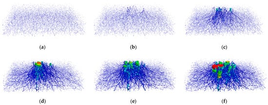 Force chains under various compressive displacement conditions. (a) 0 mm; (b) 1 mm; (c) 2 mm; (d) 3 mm; (e) 4 mm; (f) 5 mm.