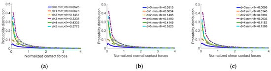 Probability density distribution of the contact forces. (a) contact forces; (b) normal contact forces; (c) shear contact forces.