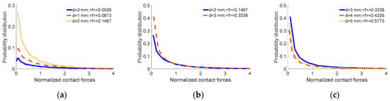 Probability density distribution of the contact forces at different displacements. (a) 0–2 mm; (b) 2–3 mm; (c) 3–5 mm.