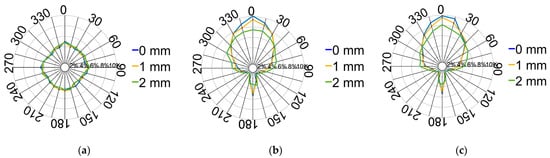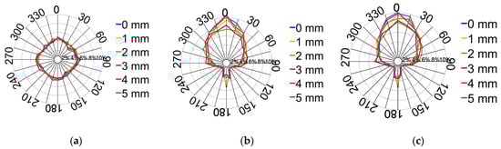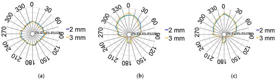 In the XOY plane, the distribution exhibits symmetry, converging towards the vertex along the three axes and forming a rectangular pattern that closely aligns with the geometry of the pressing plate. In the XOZ plane, the distribution takes on a leaf-like shape, primarily concentrated along the longitudinal axis at 0°, a characteristic consistent across the YOZ and XOZ planes. The process under varying displacements was categorised into three stages to further investigate the variations in the probability distribution of the strong contact force directions at different displacements. The results are depicted in Figure 16, Figure 17 and Figure 18.