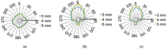 Probability distribution of the strong contact force directions from 3 mm to 5 mm. (a) XOY; (b) XOZ; (c) YOZ.