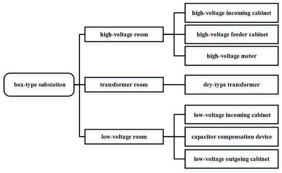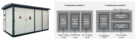 The box-type substation is composed of three parts: a high-voltage room, a transformer room, and a low-voltage room. There are two combinations, as shown in Figure 1. The high-voltage room consists of a high-voltage incoming cabinet, a high-voltage meter, and a high-voltage feeder cabinet. The dry-type transformers are generally placed in transformer rooms. The low-voltage room is composed of a low-voltage incoming cabinet, a capacitor compensation device, and a low-voltage outgoing cabinet.