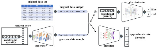 CTGAN consists of two models that present a competitive game relationship: the generative model G, which captures the distribution of data, and the discriminative model D, which estimates the probability of the sample coming from the original data. The G network generates fault samples by transmitting random noise through a multi-layer perceptron, and the D network is also composed of a multi-layer perceptron, learning and judging whether the samples come from the model distribution or the original data distribution. Under the definition of G and D by the multi-layer perceptron, the whole system can be trained by the backpropagation mechanism, and the two achieve an antagonistic game balance. In addition, there is an encoder that models the raw data, and a classifier trained on the raw data to better interpret the semantic integrity of the data. The CTGAN structure is shown in Figure 3.