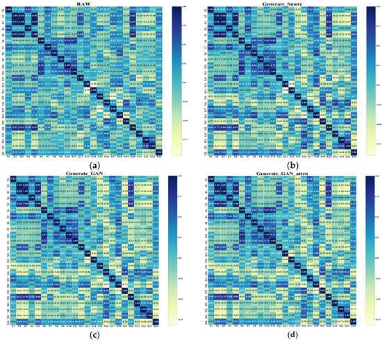 Comparison of raw data and generated data heatmap: (a) original data distribution; (b) the generated data distribution of SMOTE; (c) the generated data distribution of CTGAN; (d) the generated data distribution of SA-CTGAN.