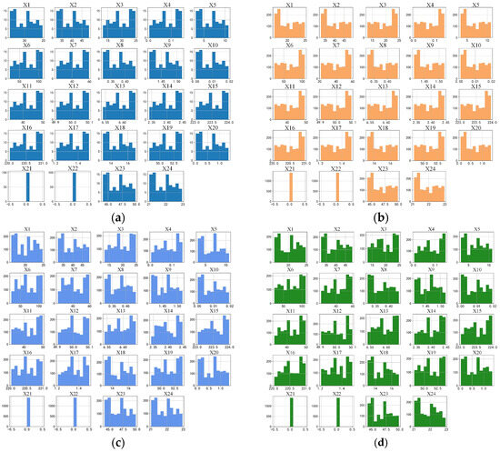 Furthermore, draw a distribution histogram, comparing the derived data results through the distribution of 24 indicators, as shown in Figure 9, where (a), (b), (c), and (d) are the distribution of original data, SMOTE-generated data, CTGAN-generated data, and generated data, respectively.