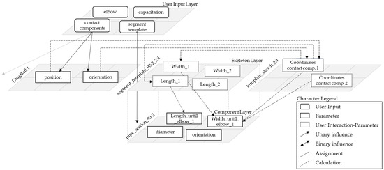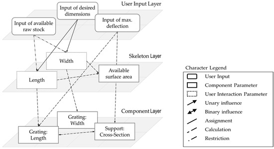 An extension of the CommonKADS approach is the correlation model (Figure 1), which was developed specifically for planning the parametrization of CAD models [16]. This tool supports designers to model correlations only top–down, avoid circular references, and distinguish between different hierarchy levels. Additionally, it visualizes the length of a dependency chain to estimate model efficiency. The correlation model is divided into three layers. The user input layer consists of all the parameters that the user communicates to the system. The model is visualized with the parameter control of a steel platform: the user enters the desired dimensions, maximum deflection, and the available raw stock. These inputs restrict the size of the beams for the support or the gratings. The skeleton layer is the abstraction of the parameter control concept and transforms the user inputs to the control parameters of the single components. The parameters on this layer can be used to define a design skeleton or derive interaction elements such as drag points. The component layer connects elements of the knowledge-based CAD model, such as geometric features in a part model or components in an assembly model, to the other layers.