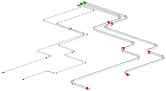 The basic idea behind the industry use case of this study is not complete automation for routing designs, as shown in Figure 2, but to raise the efficiency in the design process with an interactive modular piping 3D CAD configuration system. Designers should have the ability to specify the position and orientation of the starting and ending connectors (represented by green and red cylinders, respectively), as well as define and subsequently modify the position and orientation of instrumentation or supports (represented by red spheres), and efficiently add routings between them.