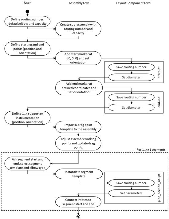 The basic components of the routing master assembly (Figure 10) are four work points. The first, to which the starting point marker will be attached, is always located at the assembly origin. The other three markers, two of which are used for setting the positions of the drag points, and one for the end marker, are defined by a sketch, i.e., the routing skeleton, in their respective positions. This skeleton uses just driven reference parameters between the assembly origin and sketch points and is then switched to adaptive to achieve the drag point functionality. For adapting the routing after initial configuration, this sketch needs to be activated, and the corresponding drag point must be moved. The reference parameters are necessary for later constraining, but their value cannot be modified due to the writing protection associated with them. The work points are also fitted with iMates for automatic placement of the drag-balls and the start and end markers according to the workflow defined before. These markers are necessary since work points cannot be picked as contact components with the function ThisApplication.CommandManager.Pick(SelectionFilterEnum.kAssemblyLeafOccurrenceFilter) to add the predefined routing templates in between.