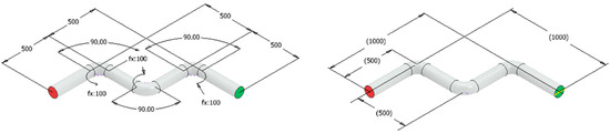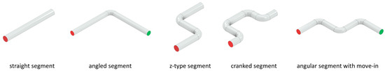 The specification of the piping engineers included five basic segment templates (Figure 7). The first is a straight segment where the distance between two drag points is bridged. For the high level of detail, the assembly contains a sequence of standard-length pipes, joint preparation, and welding information. The second is an angled segment with one elbow to connect instrumentation perpendicularly, while the z-type bridges instrumentation with parallel axis with an offset. The fourth and fifth are a cranked and angular segment to run around obstacles.