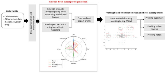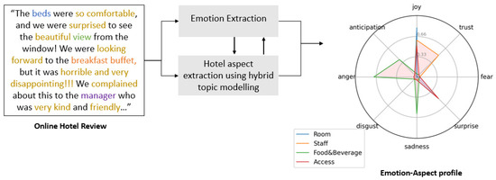 To this end, online reviews have become one of the most valuable sources of information in the digital age, providing an opportunity for customers to share their post-purchase experiences [3]. This information is useful for potential customers as well as for organizations to manoeuvre their decision-making [4]. An online review is an unstructured piece of text that encompasses customers’ experiences and emotions in an unorganized manner. Given the importance of such information, topic and sentiment analyses using online hotel reviews have gained the attention of researchers and many extant studies have focused on detecting hotel aspects and identifying emotions and sentiments from hotel reviews [5,6,7,8]. However, these approaches lack a more in-depth exploration on utilising customer emotions as insights for decision-making. Since an online review cannot be easily quantified due to its textual form, it is essential to transform the expressed emotions and the mentions of hotel aspects into a structured and quantifiable format that can be effectively applied for decision-making and analysis.