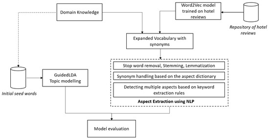 To initiate the keyword extraction process, we developed a vocabulary specific to each aspect, consisting of various properties associated with them. By expanding this vocabulary using the trained Word2Vec model, we generated a finely tuned aspect dictionary, including synonyms for each aspect. Additionally, to systematically widen the scope of aspect extraction, we incorporated a semi-supervised topic modelling approach, employing Guided Latent Dirichlet Allocation (GuidedLDA) [43]. GuidedLDA utilizes the initial seed word list, comprising the previously extracted keywords, to categorize each review into potential topics. Figure 3 illustrates the high-level process of aspect extraction applied in this study.