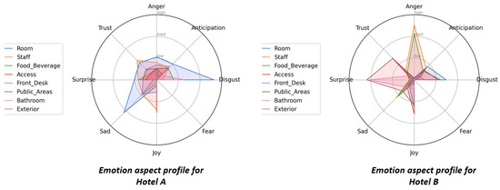 This approach allows for creating an individualized visualization for each hotel based on the emotions and hotel aspects providing customized insights. The following Figure 5 shows the emotion-aspect profile of two hotels based on their customer comments recorded on social media.
