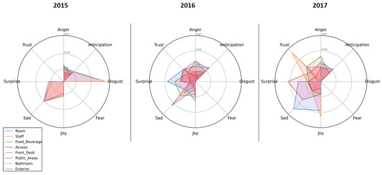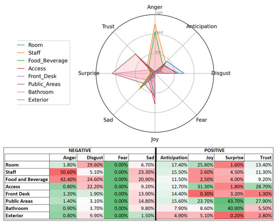It can be observed that the aspects ‘Staff’ and ‘Food&Beverage’ have a higher intensity of ‘Anger’ and ‘Sad’ expressed in reviews compared to other aspects. Moreover, the aspect ‘Room’ has shown higher intensity in ‘Disgust’. In positive emotions, it can be seen that ‘Public Areas’ and ‘Bathroom’ have increased intensity in ‘Surprise’, denoting a positive experience. The aspects ‘Access’ and ‘Room’ have mixed emotions of ‘Disgust’, ‘Joy’ and ‘Trust’. The spectrum of emotions per each aspect denotes how customers position their experiences and enables them to identify the best- and worst-performing services of a hotel.