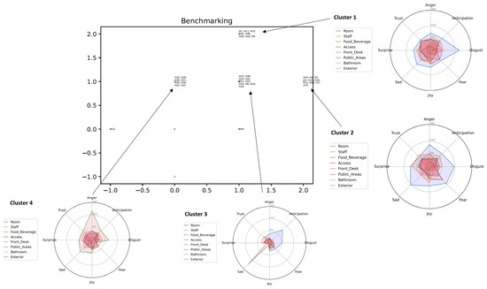 Based on the derived emotion-aspect profiles, further analysis was conducted using the GSOM algorithm to create a segmentation of all 44 hotels based on the derived deep emotion intensity values. The 44 hotels’ emotion variations per each aspect were fed into the GSOM to create a benchmarking visualisation. It was noted that there were four distinct clusters (profiles) based on their emotion variations. As the hotels that have been grouped showcase similar characteristics, the hotels can identify other similar hotels that perform similarly. Figure 7 illustrates the identified profiles and their distinct characteristics based on customer emotions.