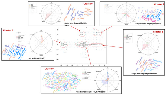 As observed, Cluster 1 exhibits angry customers with an intense expression of anger directed towards staff. In Cluster 2, customers express both anger and disgust, voicing complaints about staff and bathroom aspects. However, on the right side of the map, in Clusters 3 and 4, customers showcase more positive emotions. Cluster 3, comprised of positive customers, highlights mentions of staff and location in their reviews. In contrast, customers grouped in Cluster 4 have expressed high intensity of joy, complimenting the room and location.