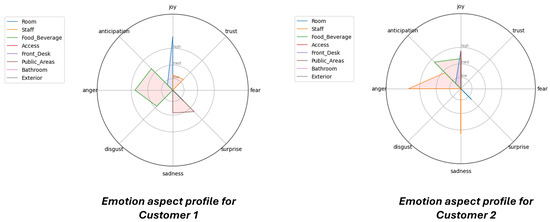 Figure 10 displays the emotion-aspect profiles of two customers, based on their online reviews for the same hotel during the same time period (month). The two profiles reveal distinct experiences encountered by these customers, with varying emotions and mentions of hotel aspects. Customer 1 exhibits a predominantly positive emotional state compared to Customer 2, who expresses high levels of anger and sadness towards the hotel staff. Customer 1 reflects joy and trust emotions concerning the staff and room, while expressing anger towards the food and beverage aspect.