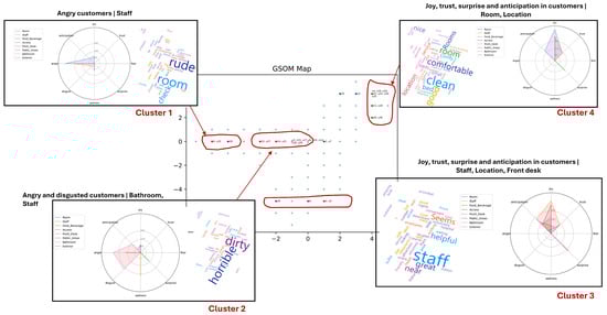 Subsequently, customers’ emotion-aspect profiles were vectorized and used as input data for the GSOM algorithm, which generated groupings providing an aggregated view of customers. Each data point in this map represents a customer, and the profiles reveal groupings of customers with similar behaviours in terms of the emotions and hotel aspects mentioned in their reviews (Figure 11).