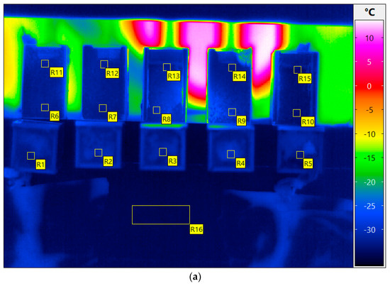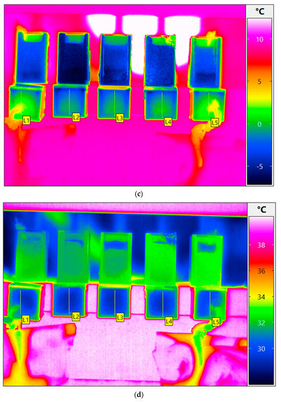 At the end of the sublimation phase, the pressure was reduced further and the secondary drying commenced after 34 h, lasting about 10 h. In Figure 5d and Figure 6d, it can be observed that the thermal effect due to the presence of probes is still visible, but it is much weaker. It is, however, noteworthy that the upper layer of the material during later stages of the secondary drying were cooler than the bottom due to the heating from the shelf. This was observed in earlier works as well [6], but those results lacked the higher resolution available in this study. The supplementary materials contain a figure that shows a graph of this evaporative cooling effect (Figure S6).