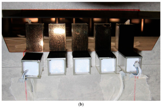 The sublimation step started after the annealing step was completed by evacuating the freeze-drying chamber down to about 0.06 mbar, which then progressed for 23 h. Figure 4b shows that the sublimation rates were higher in cuvettes 1 and 5 (the slope is steeper 18–22 h into the program). This is in agreement with Roy and Pikal’s observations [4]. At the beginning of the sublimation phase after 13.7 h, it can be seen from Figure 5b and Figure 6b that the temperature at the surface of the cuvettes was rather uniform around −29 °C regardless if a probe was present or not. In contrast to that, after 28.1 h, it can be observed in Figure 5c and Figure 6c that there was a temperature difference of approximately 3.5 K at the surface in cuvettes 1 and 5 as compared with the cuvettes without probes. As mentioned before, care was taken not to measure the wires that connected the probes to the freeze-dryer. The thermal effect of the probe and the faster progress of primary drying can clearly be seen in Figure 7 as well. The leftmost cuvette (containing a Pt100 probe) was clearly ahead of the other two cuvettes also along the depth profile.