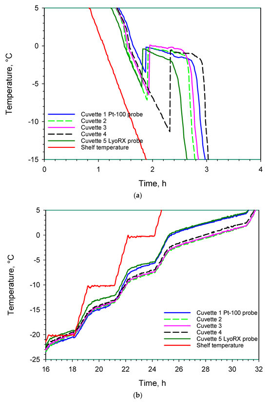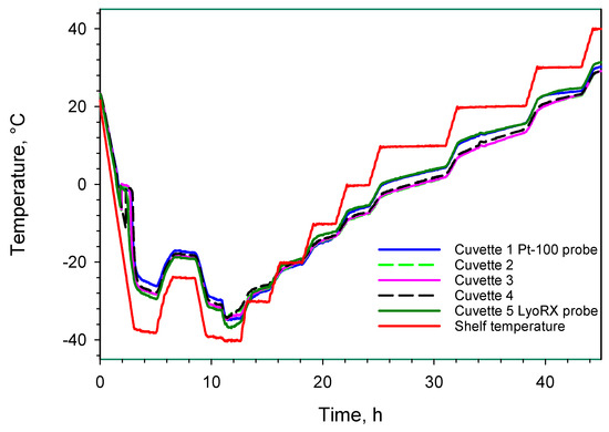 The following supporting information can be downloaded at: https://www.mdpi.com/article/10.3390/app14073120/s1, Figure S1: Nucleation temperatures can be seen at the dip of each measurement area on the y-axis with respective time of nucleation on the x-axis. Measurements of average temperature at the top and bottom of each cuvette R6 to R15and R16 were used to generate the plot. Figure S2: Entire freeze-drying process; top and bottom view of cuvettes with and without probes using average temperature readouts from R6 to R15 and R16. Figure S3: Primary drying process, top and bottom view of cuvettes 1 to 5 with and without probes using average temperature readouts from R6 to R15 and R16. Figure S4: Selection showing primary drying process. Surface, top and bottom view of cuvettes 1 and 2 with and without a probe using average temperature readouts from R1, R2, R6, R7, R11, R12 and R16. Figure S5: Thermogram of cuvettes 1 to 5 with profiles L1 to L5 at the surface and L6 along the depth profile after 2700 min, 45 h. Figure S6: Temperature readout of lines 1–6 as a function of cuvette at the surface and depth (for line 6) after 2700 min (45 h). Video S1: The 2700 thermograms of the whole freeze-drying cycle have been converted into a film-clip covering 45 h from −40 ° C to 40 °C. The thermal effect of the probes can clearly be seen at the surface in the cuvette to the left and to the right especially when the shelf temperature reaches 0 °C and higher.