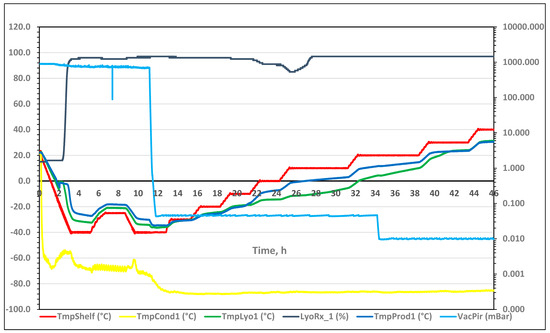 Full freeze-drying cycle of the pharmaceutical formulation based on machine readings of product temperature from Pt-100 sensors (TmpProd1 and TmpLyo1), shelf-temperature, pressure (VacPir), ice-condenser temperature and resistivity (Lyo-RX, displayed in %, left y-axis).