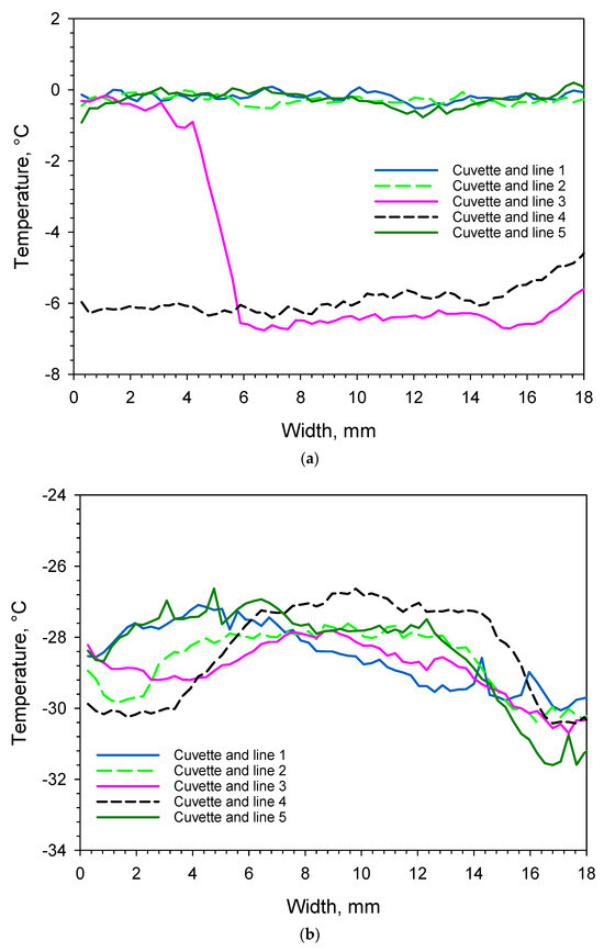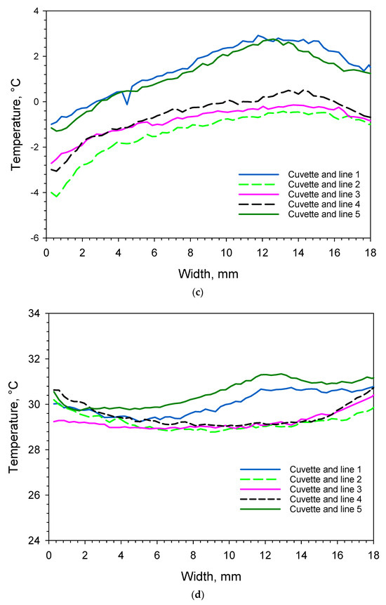(a) Temperature readout of lines 1–5 as a function of cuvette width after 116 min (1.93 h), see text for further explanations. (b) Temperature readout of lines 1–5 as a function of cuvette width after 820 min (13.7 h) with a rather uniform temperature of −29 °C. (c) Temperature readout of lines 1–5 as a function of cuvette width after 1685 min (28.1 h) with two different temperature ranges. The material with probes is about 2 °C and the material without probes is −1 °C. (d) Temperature readout of lines 1–5 as a function of cuvette width after 2700 min (45 h) with a rather uniform temperature of 30 °C.