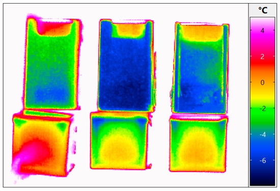 Thermogram of cuvettes 1, 2 and 3 after 1685 min (28.1 h). The shelf is displayed in white because it had already reached 10 °C and is out of the colour-coded range for the temperature scale. The leftmost cuvette is equipped with a Pt100 probe.