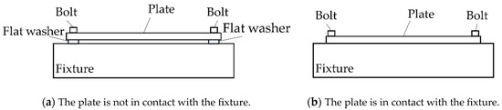 To investigate the influence of the normal contact stiffness of the contact interfaces on the natural frequencies and mode shapes of the bolted flat plate, modal tests were conducted under two different contact boundary conditions, as shown in Figure 6. Firstly, 0.8 mm thick flat washers were inserted between the plate and the fixture at the bolted connections to ensure that there was no contact between the plate and the fixture, and the bolts were tightened using a torque wrench. Subsequently, the flat washers were removed and the bolts were tightened with the same torque as before, allowing contact between the plate and the fixture. In this case, the flat washers were used to isolate the test plate from the fixture, preventing any contact between them.