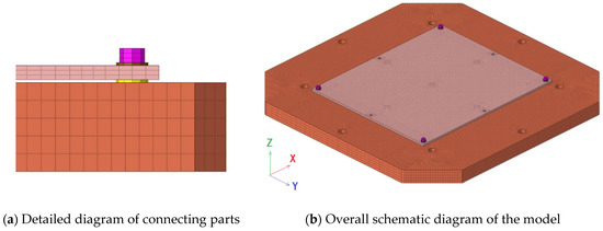 First, a finite element model of the bolted connection structure between the flat plate and the fixture was established without contact between them, as shown in Figure 7. The finite element models for each component were built using hexahedral solid elements, where the plate comprised 15,876 elements, the fixture included 64,550 elements, the bolts contained 576 elements, and the flat washers had 192 elements. The boundary conditions were defined by constraining the six degrees of freedom at the nodes of the eight screw holes on the fixture model. Additionally, preload forces were incorporated into the bolt model, corresponding to the torque applied during the experimental setup.