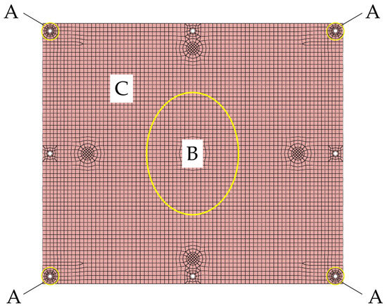Region A represents the bolted connection area, which is tightly connected and has a large contact stiffness. The contact between the flat plate and the fixture in this area is simulated using a shared node approach. Region B, located in the center of the flat plate, is modeled using BUSH elements with high stiffness to simulate the large contact stiffness caused by significant surface pressure. Region C, outside of the aforementioned areas, is modeled using BUSH elements with low stiffness to simulate the small contact stiffness under lower surface pressure. A total of 458 BUSH elements are established in region B, and 4598 BUSH elements are established in region C, using the flat plate node-fixture node approach. The finite element model under the contact conditions between the flat plate and the fixture is established based on the above analysis, as shown in Figure 9, because the plate is in contact with the fixture; the length of the BUSH unit is zero.