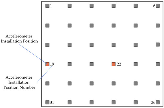 This research employed a feature-level swept frequency experiment, applying a vibration acceleration of 1 g in the normal direction of the flat plate. The plate had 36 sampling points, arranged in a transverse sequence on the board, as illustrated in Figure 3 (6 × 6 distribution). Points 1 and 19 served as modal reference points, with fixed accelerometers placed at these two points to collect data from each experiment. The remaining thirty-four sampling points were sampled by dividing them into seventeen groups, each using two accelerometers. The time-domain data from each sampling point were imported into the software DASP to form a Hankel matrix. The data were then globally fitted using the Stochastic Subspace Identification Method, thus obtaining the modal frequencies and corresponding modal shapes of the flat plate.