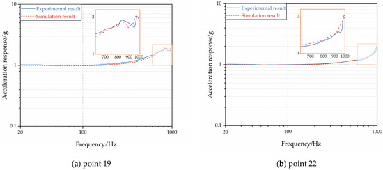 The comparison of frequency response curves for points 19 and 22 is shown in Figure 12 and the comparison between experimental and simulation modes is shown in Table 4. The comparison of frequency response curves in Figure 11 shows that, within the 0–1000 Hz range, the simulated frequency response curves match the experimental frequency response curves very closely.