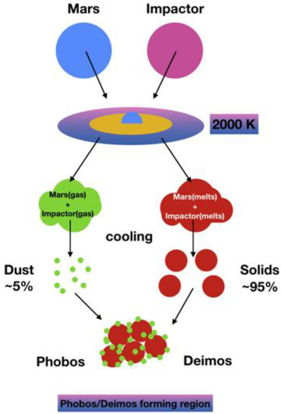 The giant impact scenario is also consistent with telescopic observations of the surfaces of both moons, suggesting a composition different from that of Mars. In this case, the composition of the disk materials is treated as a mixture of Martian and impactor materials (Figure 3) [14].