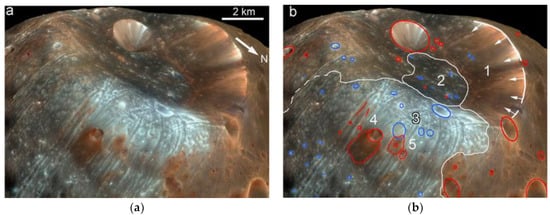 (a) View of Stickney crater and its eastern rim; (b) the same view with key geological features highlighted. Craters containing red and blue materials are outlined in red and blue, respectively. Red lines indicate outcrops of reddish material along the edges of grooves. White lines show the boundaries of geological units. HiRISE_PSP_007769_9010_IRB image synthesized from photos taken in the infrared (800–1000 nm), red (550–850 nm), and blue-green (400–600 nm) channels [12] (numbers from 1 to 5 according to [12]). Numbers: 1 (and white arrows)—part of the massive landslide moving down from the W-NW sector of the crater inner walls; 2—the hummocky surface texture deposit; 3—the landslide body acquired sufficient momentum for the frontal part of the moving landslide mass to travel up the interior of the wall and onto the eastern rim of the crater; 4—the 700 m crater, whose interior, eastern rim, and the area further to the east are red, while the area around the crater is blue, except the part to the east; 5—crater about 100 m in diameter is surrounded by a relatively wide (200–500 m) red halo, interpreted as its ejecta [12].