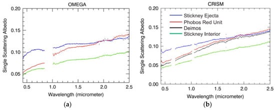 - Fraeman, A.A.; Arvidson, R.E.; Murchie, S.L.; Rivkin, A.; Bibring, J.P.; Choo, T.H.; Gondet, B.; Humm, D.; Kuzmin, R.O.; Manaud, N.; et al. Analysis of disk-resolved OMEGA and CRISM spectral observations of Phobos and Deimos. J. Geophys. Res. 2012, 117, E11. [Google Scholar] [CrossRef]