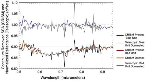CRISM and telescope observations—approximate small absorption band at around 0.65 µm for Deimos and for the red unit of Phobos [37].