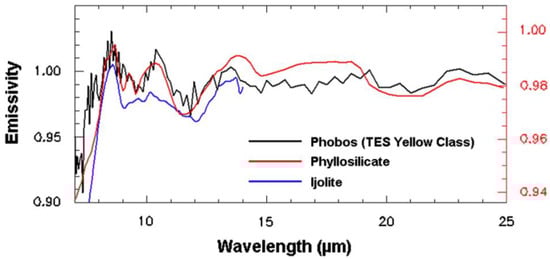 Matching the emissivity spectrum (thermal radiation emission) of Phobos’ surface with spectra of silicate material (vertical color-coded curves correspond to the right axis) [40].