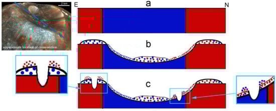 A schematic cross-section through the Stickney crater (from its eastern rim towards its center to its northern rim) with delineated stages of the formation of the observed morphology and distribution of red and blue units: (a) stage 1, (b) stage 2, and (c) stage 3 [12].