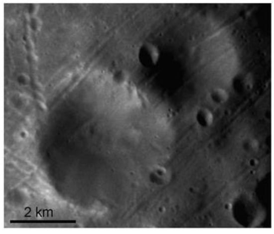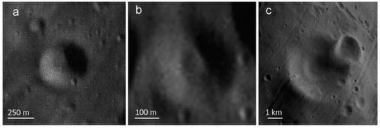 Portions of HRSC images h8974, h9574, and h2780: (a) elliptical crater with lengths of 750 m and 250 m, (b) Hall crater with a diameter of 6.2 km, and (c) Drunlo crater with a length of 4.6 km [12].