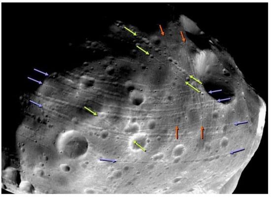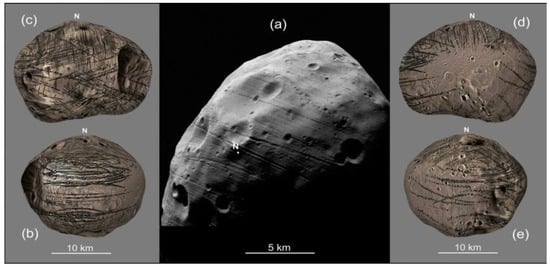 - Murray, J.B.; Heggie, D.C. Character and origin of Phobos’ grooves. Planet. Space Sci. 2014, 102, 119–143. [Google Scholar] [CrossRef]