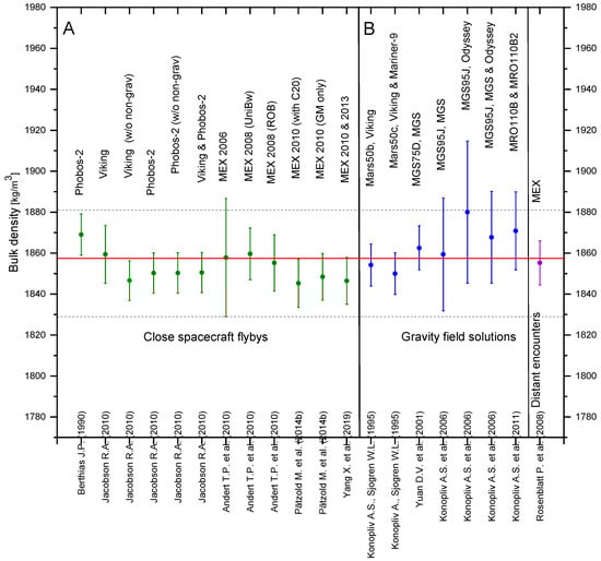 - Pätzold, M.; Andert, T.; Jacobson, R.; Rosenblatt, P.; Dehant, D. Phobos: Observed bulk properties. Planet. Space Sci. 2014, 102, 86–94. [Google Scholar] [CrossRef]