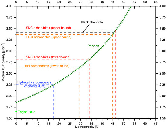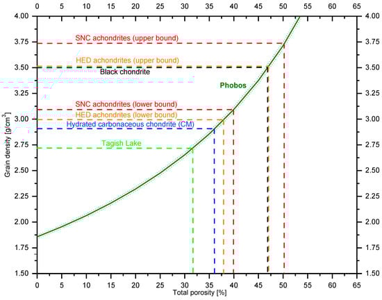 Phobos is suspected to be highly porous, indicated by the presence of the Stickney crater on its surface [1,25]. The formation of such large craters on a small body requires significant porosity, preventing the body from being destroyed during the impact process [81]. Utilizing grain densities (Table 4), the total porosity of Phobos was determined to be in the range of 31.73–50.21% (Table 4, Figure 23). These values closely mirror the porosity of C-type asteroids (40–60%).