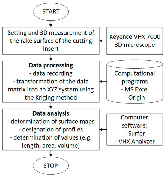 Three-dimensional imaging of the rake face of the inserts was carried out using a VHX 7000 (Keyence Corporation, Osaka, Japan) measuring microscope with dedicated Keyence software (Analizator VHX-7000_970F, version 1.4.17.3). The measurements were carried out at a constant magnification, i.e., 300×. The option of combining multiple images (7 × 7 image composition) was used with a constant recording of 150 images in the Z-axis. The adopted method allowed for the recording of the measurement data in the form of a matrix with dimensions of about 8268 rows by 10,668 columns. The conversion of data to the XYZ system was carried out using the Kriging algorithm. The range of minimum and maximum heights (upper limit–lower limit) was set manually for each measurement. The basic technical data of the measuring microscope are presented in Table 1. To analyze the measurement results, software dedicated to the microscope and Surfer software (Surfer 2024, version 26.3.269) from Golden Software were used. Figure 1 presents the methodology of the measurements. Some of the calculations and data transformations, e.g., conversion of data in the form of a matrix to the XYZ system, were performed in Origin (OriginPro 2024, version 10.1.0.178) and MS Excel (Microsoft® Excel® for Microsoft 365 MSO, version 2402).