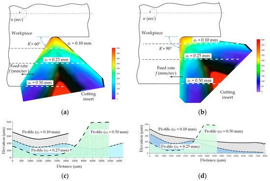 Figure 3 and Figure 4 show examples of the positions of the measuring lines for which the shape of the transverse profile of the chip groove was determined. The profiles were determined in places corresponding to the geometrical dimensions for the depth of cut ap. Profiles were determined for three depths of cut (i.e., ap = 0.1, 0.25, 0.50 mm). Two insert positions corresponding to different inserts were analyzed, corresponding to different ways of clamping the insert in the holder. Two positions were assumed for the of major cutting-edge angle: K = 60° and K = 90°. The drawings schematically show the position of the inserts in relation to the workpiece. The shapes of the obtained profiles are shown in Figure 3b,d for the insert with the SGF chip former and in Figure 4b,d for the insert with the SF chip former.
