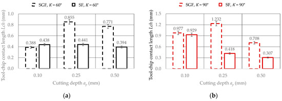 Comparison of the measurement results of the theoretical tool-chip contact length Lch with the SGF and SF chip-former profile. (a) Tool-chip contact length Lch for inserts with the major cutting-edge angle K = 60°. (b) Tool-chip contact length Lch for inserts with K = 90°.