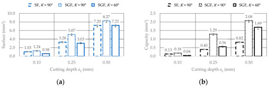 Figure 6 shows an example of the measurements of the theoretically maximum chip displacement area on the rake face and the volume of the chip groove. It has been observed that both the theoretical contact area of the chips with the cutting edge and the volume of the chip former depend on the depth of cut. A comparative analysis of the measurement results showed that higher values were obtained for inserts with an SGF chip former than for inserts with an SF chip former (from about 1.5 to more than 3 times higher) regardless of whether the major cutting-edge angle K was adopted.