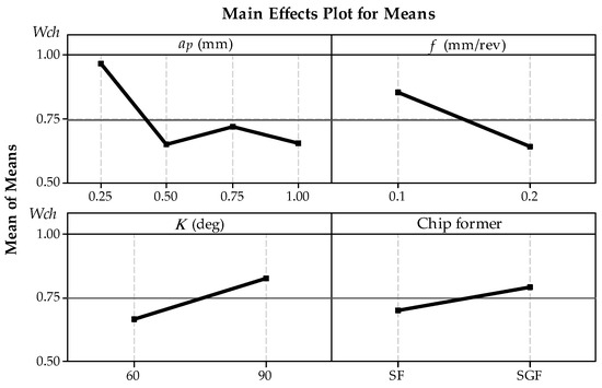 The analysis of the data showed that the feed rate had the most significant influence on the chip form and the average values of the chip-breaking coefficient Cch in the longitudinal turning process. According to statistical analysis, the parameters with a higher F value had a greater influence on the responses represented in Table 5. Moreover, the depth of cut ap, feed f and major cutting-edge angle K contributed 45.7%, 30%, and 17.6% of the response to the chip-breaking index value Cch when the test alloy was turned. The chip-former type ranked last.