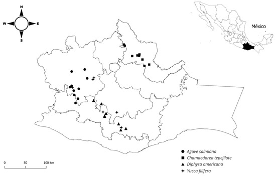 - The maguey pulquero or agave (Agave salmiana Otto ex Salm-Dyck, Agavaceae) is endemic to Mexico and grows regularly at elevations of 1230 to 2460 m in a temperate climate, forming colonies or patches or growing individually; mead, which is the raw material for pulque, is obtained from this plant species. The bunches of edible inflorescences rest on a vertical flower stalk or quiote that reaches 3 to 9 m high [23] (Figure 1b). The quiote or floral axis develops in the center of the plant after 5 to 13 years of growth. The flowers or inflorescences are known as cacayas, bayusa, golumbos, dembos, or maguey trotters; they are commercialized regionally and prepared in various ways for consumption [2]. In total, 10 inflorescence samples were collected in the Mixtec region of Oaxaca at elevations ranging from 2127 to 2573 m. In this region, a temperate climate prevails with roadsides or cultivated lands and it is found in clearings of pine–oak forest, regularly occurring in shallow soils with low fertility (Table 1).