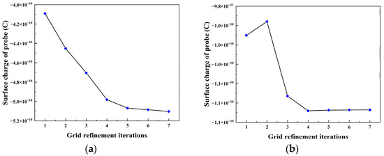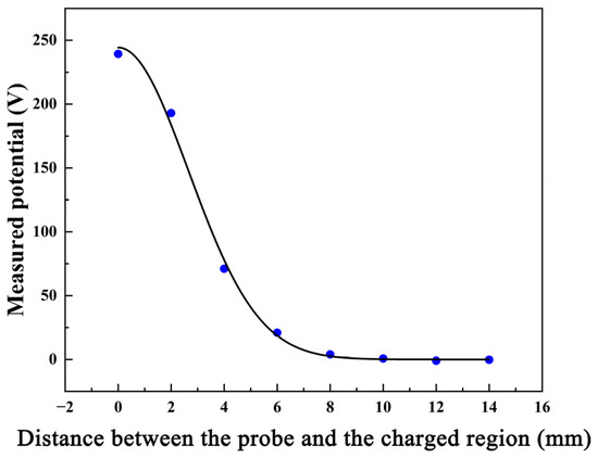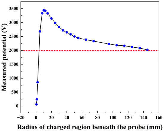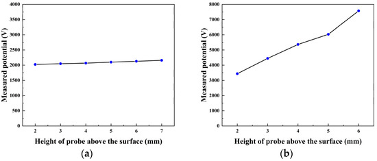 Figure 5a, it can be observed that the measured potential remains stable at around 2000 V as the distance between the probe and the sample increases from 2 mm to 7 mm. Thus, under ideal conditions, when the charged region attached to the tested material approaches infinity, the measured potential of this model is not affected by changes in the probe height. However, for dielectric materials, charges can stably adhere to fixed positions. When the region below the probe is a charged area with a radius of 10 mm and a charge density of