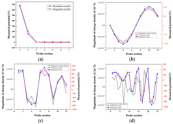 Figure 7c. The gray line represents the randomly generated surface charge density values below the probe area, while the red and blue lines represent the simulated measured potential values obtained using the Comsol model and the calculated values obtained using the formula, respectively. Although there may be some fluctuations in situations where the surface charge density varies greatly, the curves obtained from both methods are generally consistent with the characteristics of the surface charge density distribution. The calculated values are similar to the simulated values in terms of characteristics, and the numerical values are also close.